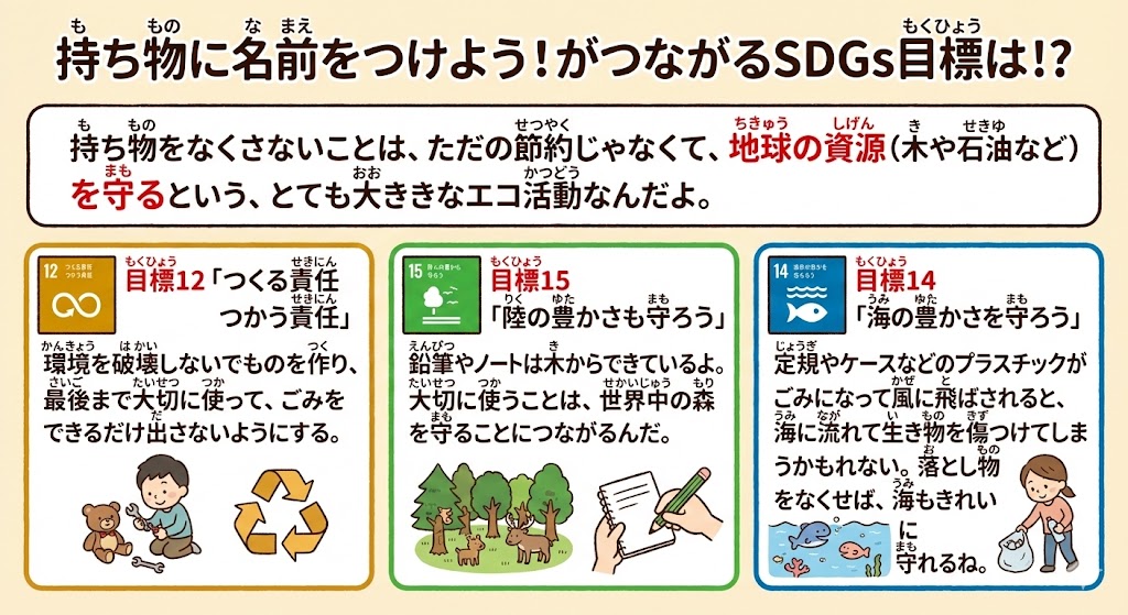 持ち物をなくさないことは、ただの節約じゃなくて、地球の資源(木や石油など)を守るという、とても大きなエコ活動なんだよ。