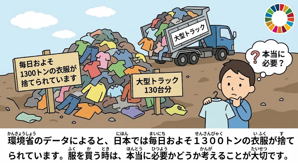 環境省のデータによると、日本では毎日およそ1300トンの衣服が捨てられています。服を買う時は、本当に必要かどうか考えることが大切です。