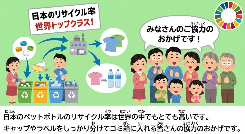 日本のペットボトルのリサイクル率は世界の中でもとても高いです。キャップやラベルをしっかり分けてゴミ箱に入れる皆さんの協力のおかげです。