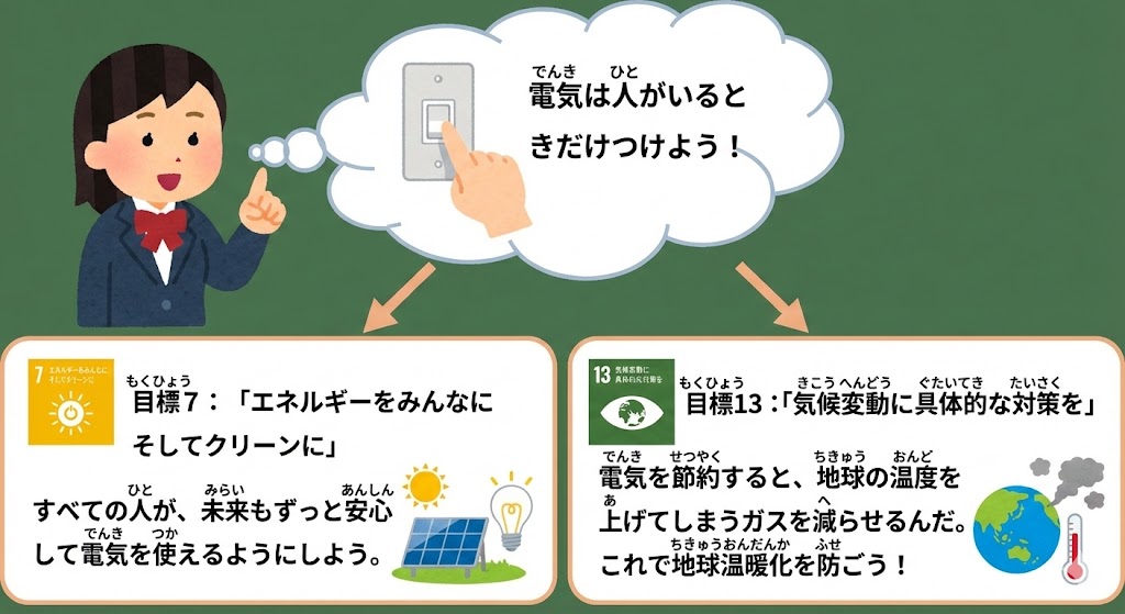 電気のむだを減らすことは、地球を守る2つの目標につながるよ。