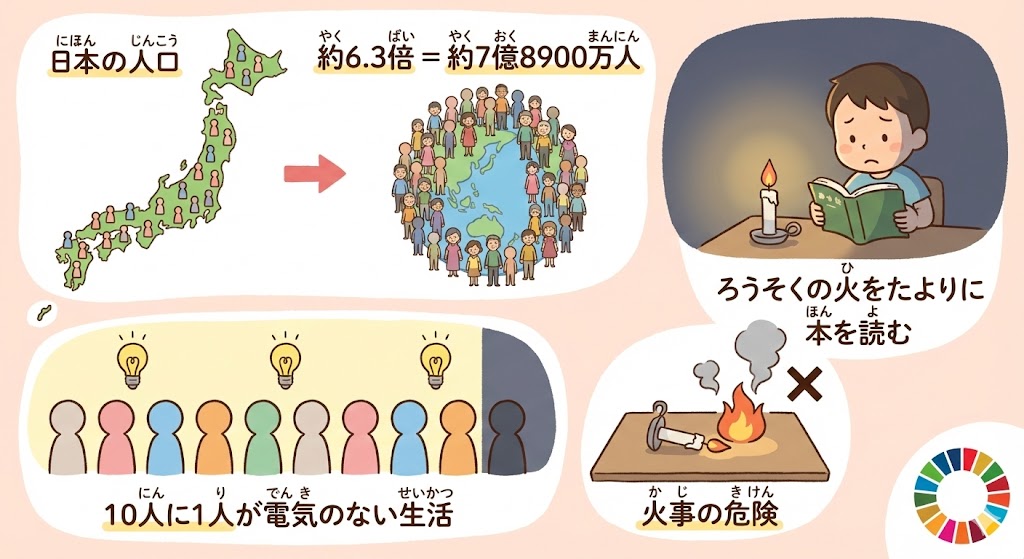 世界でいまだに電気のない生活をしている人は、世界人口の約10.4%(約10人に1人)の約7億8900万人います。