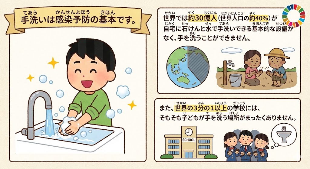 しかし、世界では約30億人(世界人口の約40%)が自宅に石けんと水で手洗いできる基本的な設備がなく、手を洗うことができません。
