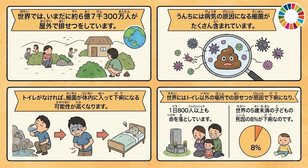 世界にはトイレ以外の場所での排せつが原因で下痢になり、1日800人以上も命を落としています。