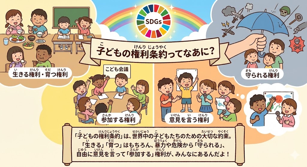 多くの国で採用されている「子どもの権利条約」では、「生きる権利」「育つ権利」のほか、戦争や暴力、有害な労働から「守られる権利」、自由に意見を表現したり、団体を作ったりして「参加する権利」も認められています。