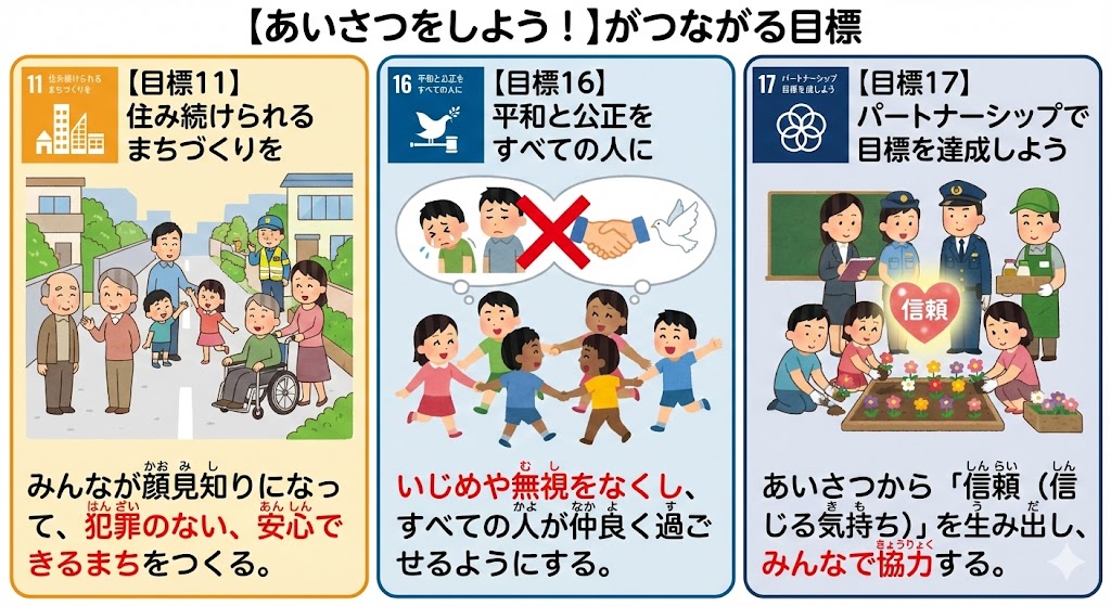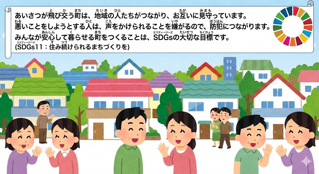 理由:あいさつが飛び交う町は、地域の人たちがつながり、お互いに見守っています。悪いことをしようとする人は、声をかけられることを嫌がるので、防犯(犯罪を防ぐこと)につながります。みんなが安心して暮らせる町をつくることは、SDGsの大切な目標です。(SDGs11:住み続けられるまちづくりを)