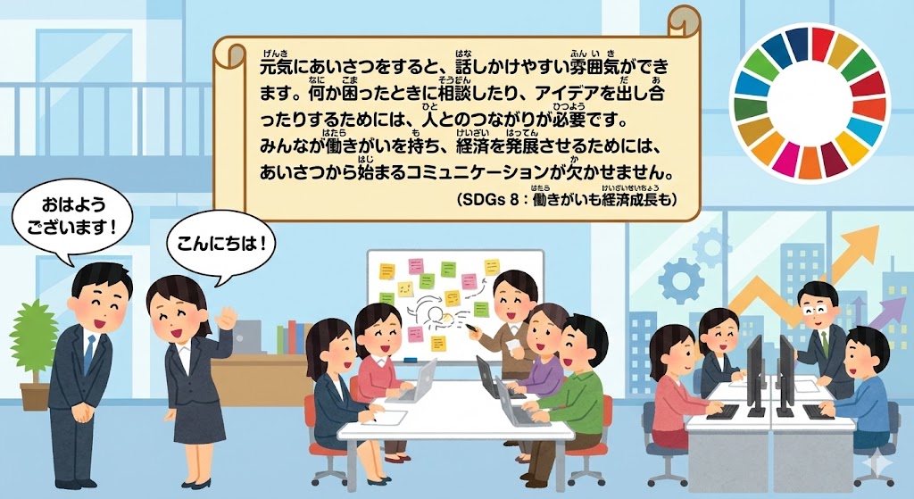 理由:元気にあいさつをすると、話しかけやすい雰囲気ができます。何か困ったときに相談したり、アイデアを出し合ったりするためには、人とのつながりが必要です。みんなが働きがいを持ち、経済を発展させるためには、あいさつから始まるコミュニケーションが欠かせません。(SDGs8:働きがいも経済成長も)