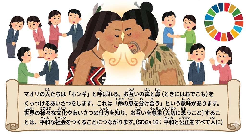理由:マオリの人たちは「ホンギ」と呼ばれる、お互いの鼻と鼻(ときにはおでこも)をくっつけるあいさつをします。これは「命の息を分け合う」という意味があります。世界の様々な文化やあいさつの仕方を知り、お互いを尊重(大切に思うこと)することは、平和な社会をつくることにつながります。(SDGs16:平和と公正をすべて人に)