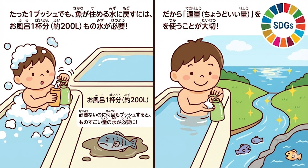 たった1プッシュのシャンプーでも、魚が住めるように薄めるためには、およそ200リットル(お風呂1杯分)もの大量の水が必要になると言われているんだ。