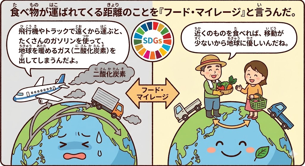食べ物が運ばれてくる距離のことを「フード・マイレージ」と言うんだ。