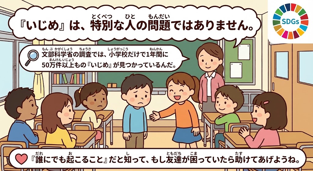 文部科学省の調査では、小学校だけで1年間に50万件以上もの「いじめ」が見つかっているんだ。