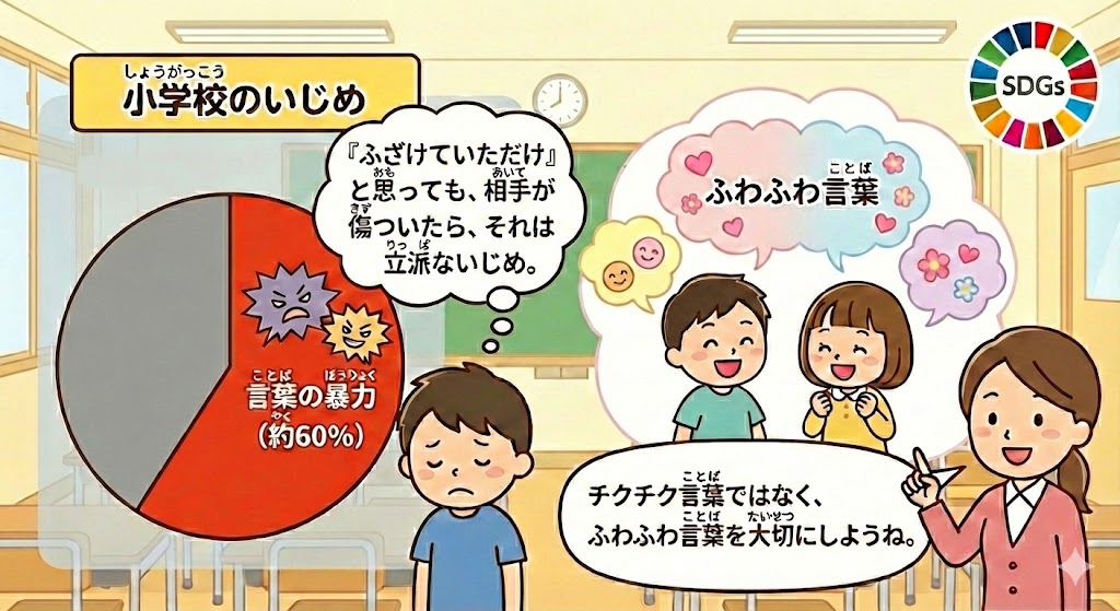 小学校のいじめの中で一番多いのは、体への暴力ではなく「言葉の暴力」なんだ(全体の約60%)。