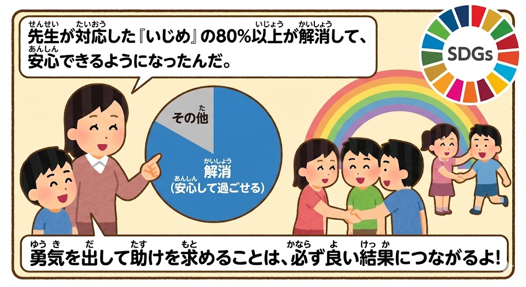 先生たちが気づいて対応した「いじめ」のうち、80%以上が「解消(いじめがなくなって、安心して過ごせるようになった)」しているというデータがあるんだ。