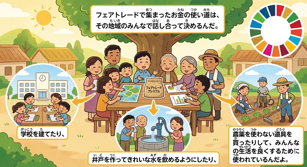みんながフェアトレードの商品を買うと、品物の代金とは別に、「プレミアム(奨励金)」というお金が生産者さんたちに渡されるんだ。