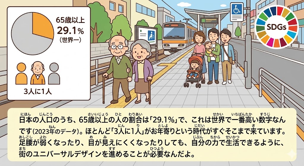 足腰が弱くなったり、目が見えにくくなったりしても、自分の力で生活できるように、街のユニバーサルデザインを進めることが必要なんだよ。