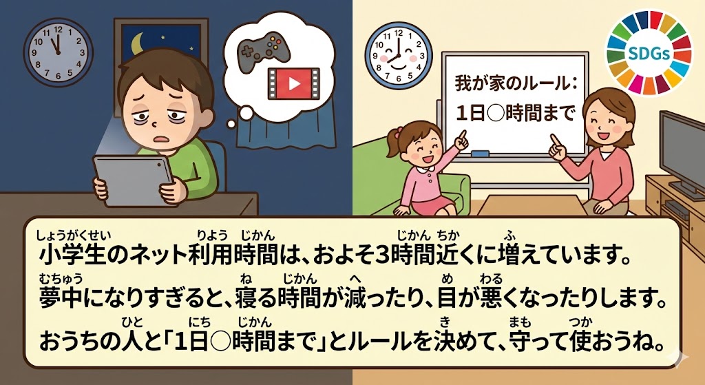 動画を見たりゲームをしたりするのは楽しいけれど、夢中になりすぎると、寝る時間が減ったり、目が悪くなったりしてしまいます。