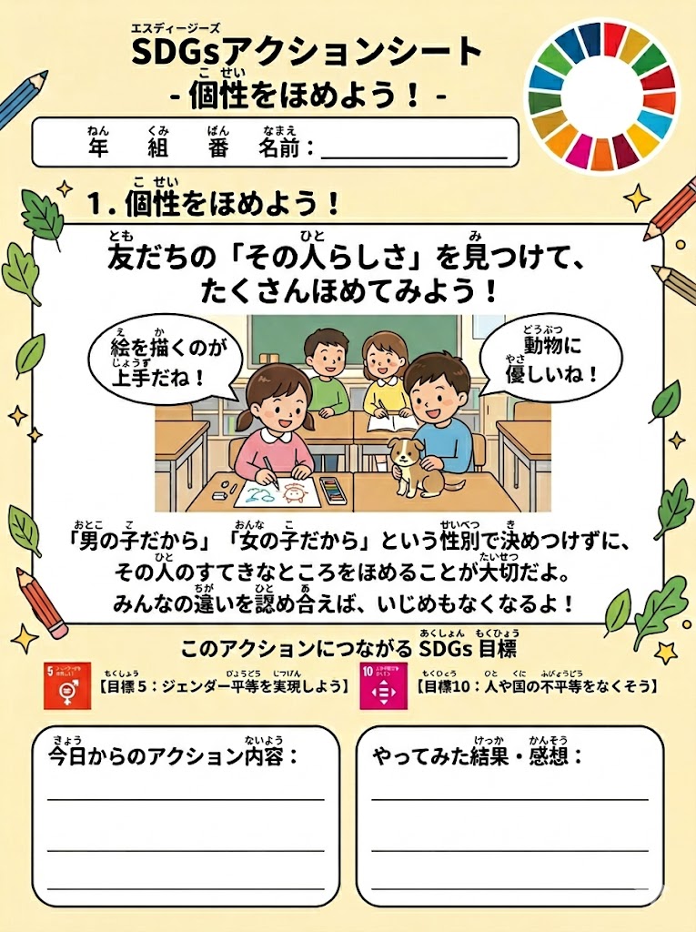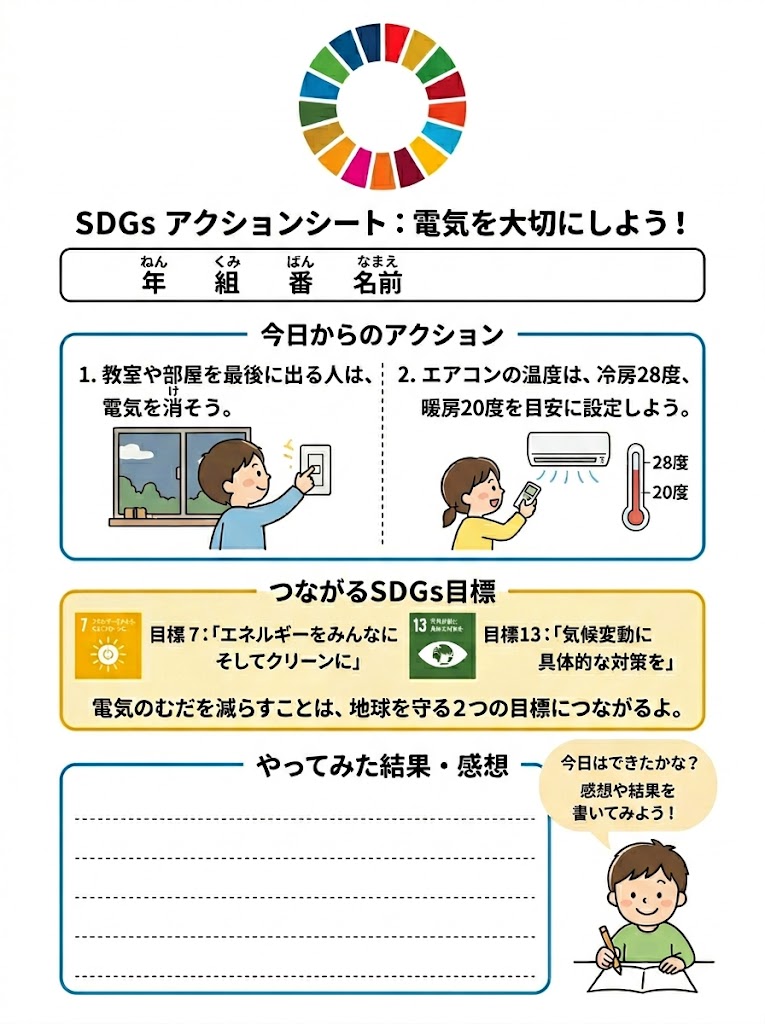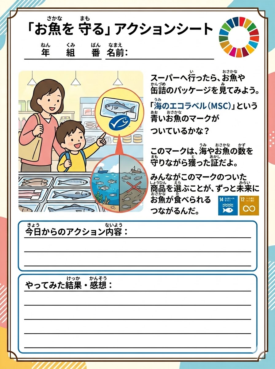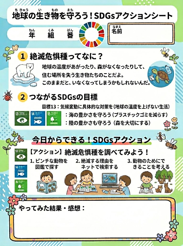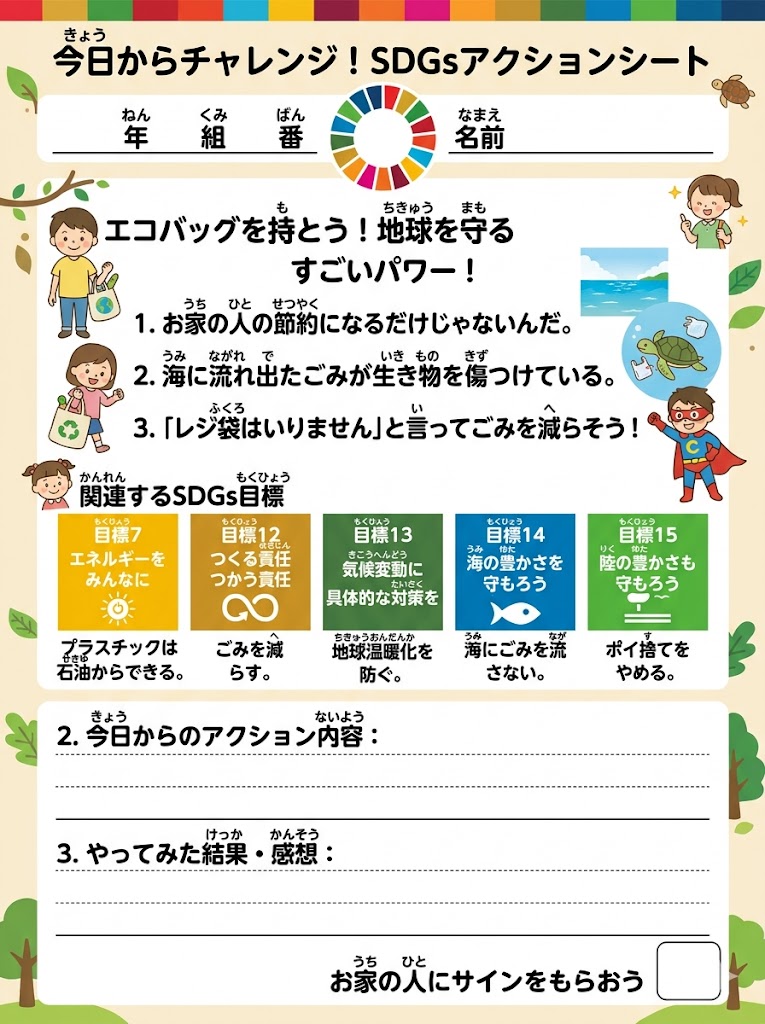 今日きょうからできるSDGsアクションを、家族かぞくで楽たのしく話はなし合あいながら宣言せんげんできる特製とくせいワークシートです。印刷いんさつして自分じぶんや家族かぞくの目標もくひょうを書かき込こむだけで、立派りっぱな自由研究じゆうけんきゅうや宿題しゅくだいのまとめになります!シートのつかいかた下...