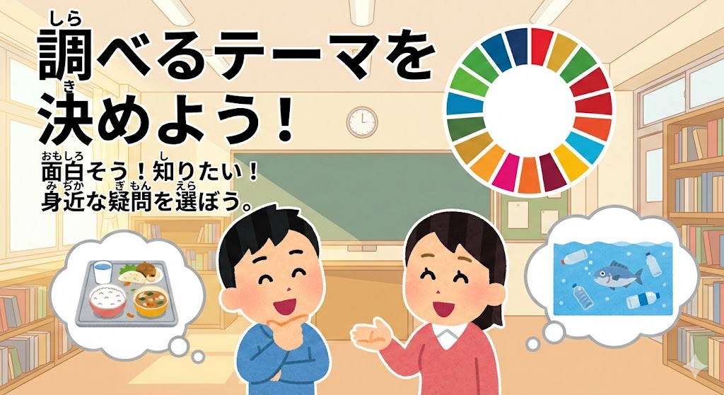 調しらべるテーマを決きめよう SDGsには17の目標もくひょうがありますが、全部ぜんぶを一度いちどに調しらべるのは大変たいへんです。 まずは、自分じぶんが「面白おもしろそう!」「もっと知しりたい!」と思おもうことをテーマに選えらんでみましょう。 たとえば、「給食きゅうしょくの残のこりはどこへ行いくの...