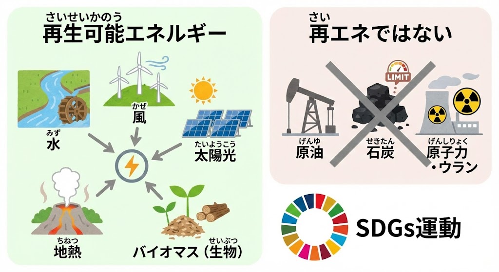 原油や石炭などといった化石エネルギーは限りある資源のため、再エネではありません。