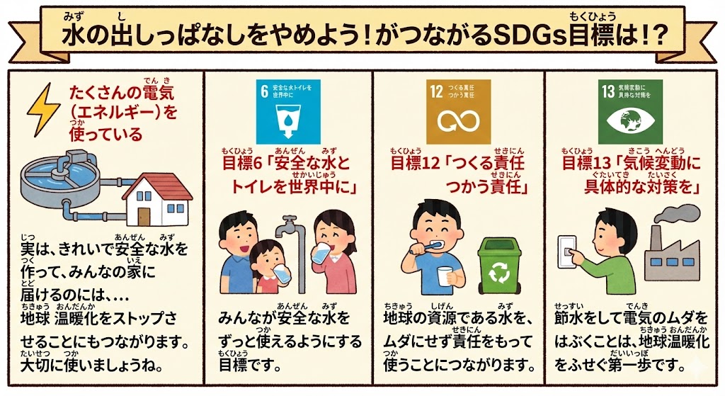 実は、きれいで安全な水を作って、みんなの家に届けるのには、たくさんの電気(エネルギー)を使っているんだよ。水のむだづかいを減らすことは、地球温暖化をストップさせることにもつながります。大切に使いましょうね。