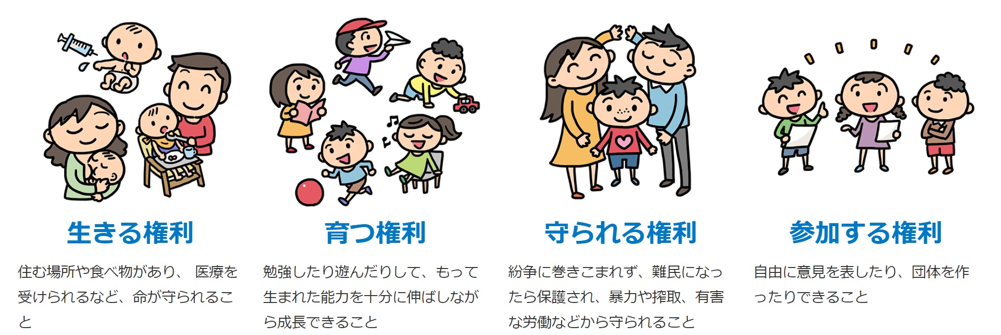 多くの国で採用されている「子どもの権利条約」では、「生きる権利」「育つ権利」のほか、戦争や暴力、有害な労働から「守られる権利」、自由に意見を表現したり、団体を作ったりして「参加する権利」も認められています。