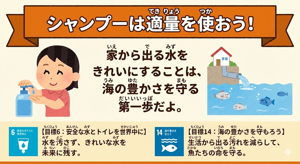 家から出る水をきれいにすることは、海の豊かさを守る第一歩だよ。