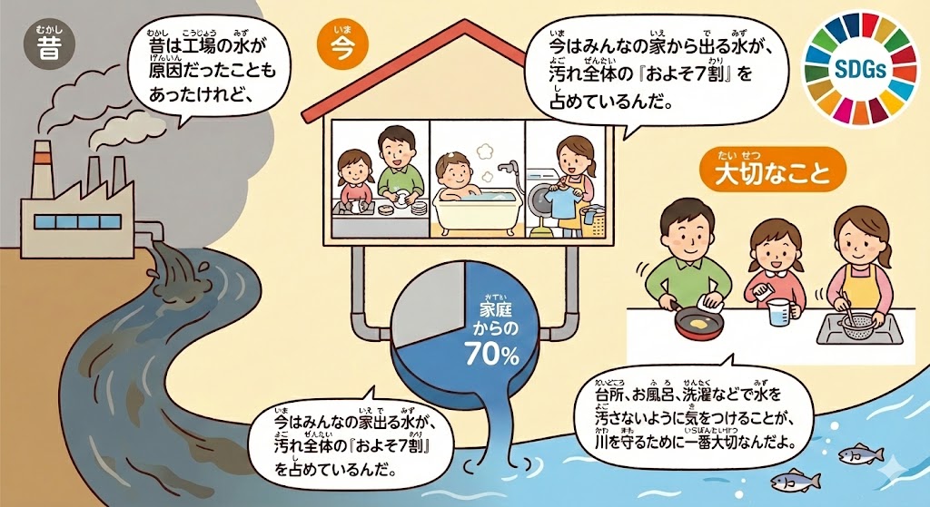 昔は工場の水が原因だったこともあったけれど、今はみんなの家から出る水が、汚れ全体の「およそ7割」を占めているんだ。