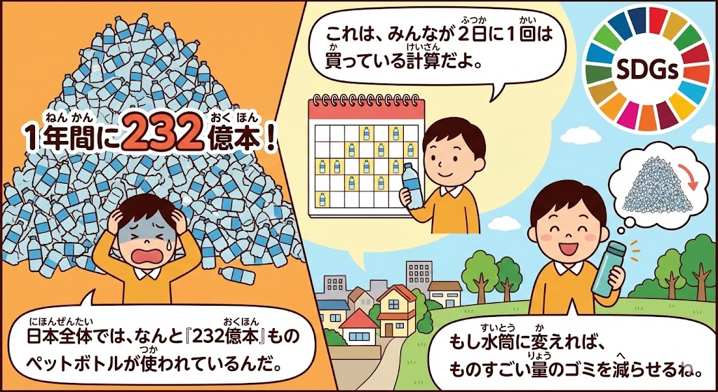 これは、みんなが2日に1回はペットボトルを買っている計算になるよ。