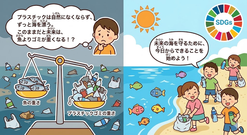 このままだと、みんなが大人になるころには、海にいる全ての魚の重さよりも、プラスチックゴミのほうが多くなってしまうと言われているんだ。