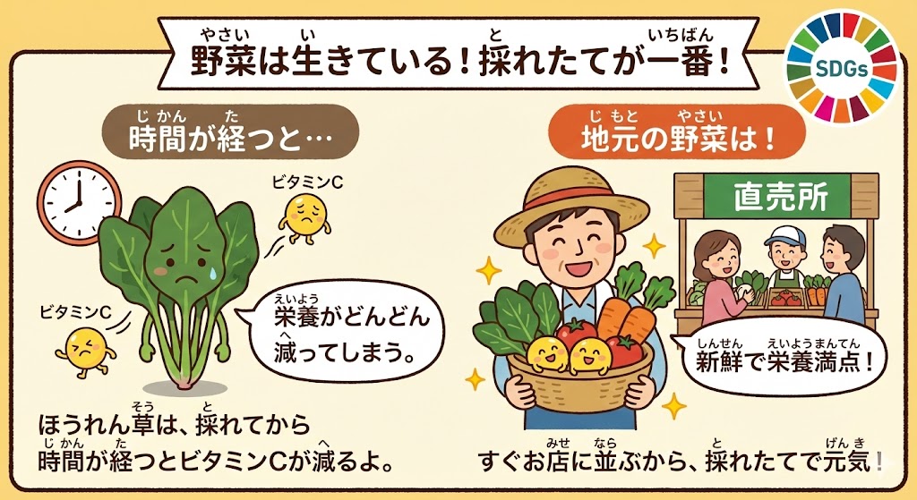 たとえば「ほうれん草」は、採れてから時間が経つと、風邪を予防する「ビタミンC」がどんどん減ってしまうことがわかっているよ。