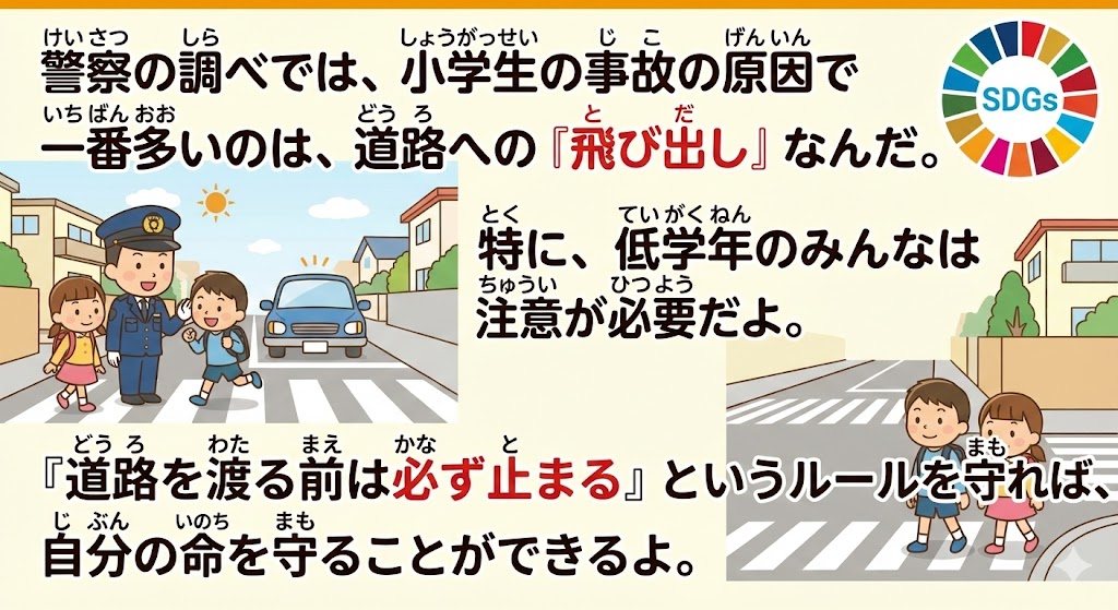 警察の調べでは、小学生の事故の原因で一番多いのは、道路への「飛び出し」なんだ。