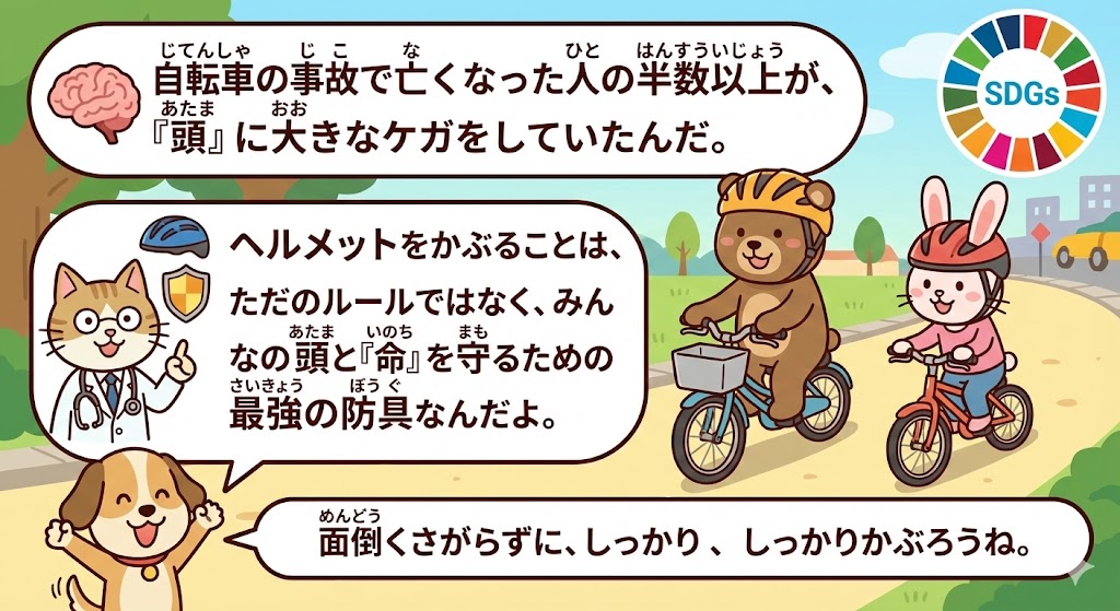 ヘルメットをかぶることは、ただのルールではなく、みんなの「頭」と「命」を守るための最強の防具なんだよ。