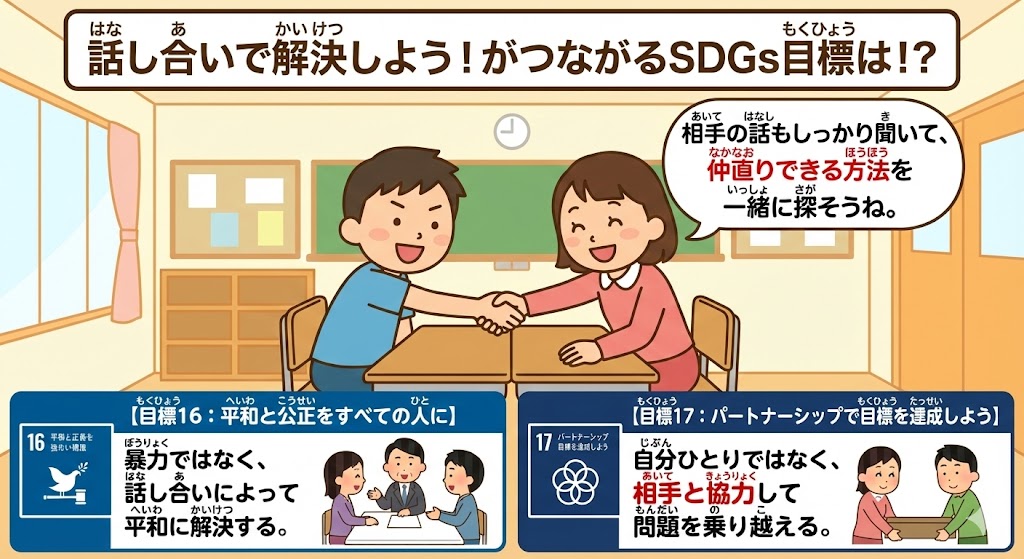 相手の話もしっかり聞いて、仲直りできる方法を一緒に探そうね。