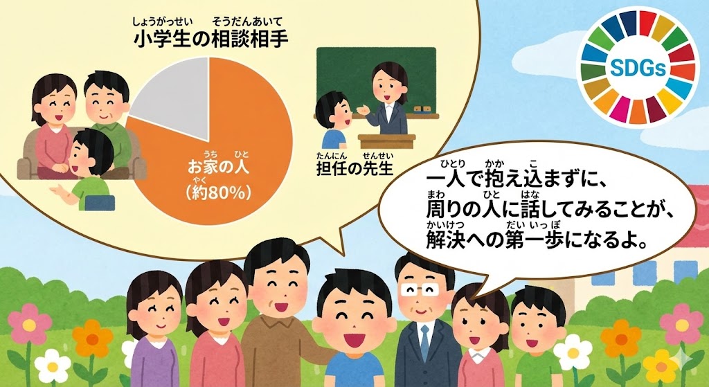 国の調査によると、小学生の約80%が「お家の人」に相談しているんだ。次に多いのが「担任の先生」だよ。
