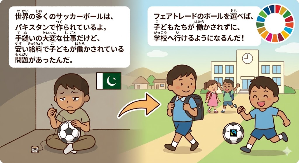 フェアトレードのボールを選べば、子どもたちが働かされずに、学校へ行けるようになるんだ。