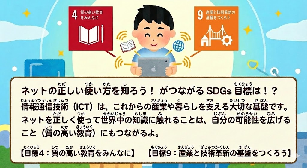 ネットを正しく使って世界中の知識に触れることは、自分の可能性を広げること(質の高い教育)にもつながるよ。